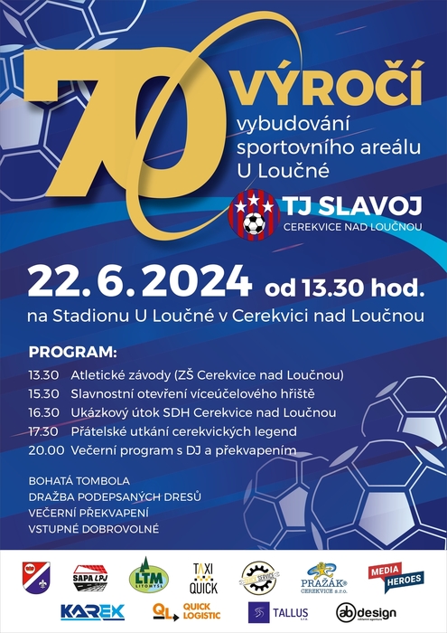 Pořadatelé srdečně zvou na oslavy areálu TJ Slavoj dne 22. června od 13,30. Program a podrobnější informace jsou uvedeny v přiloženém plakátu.
