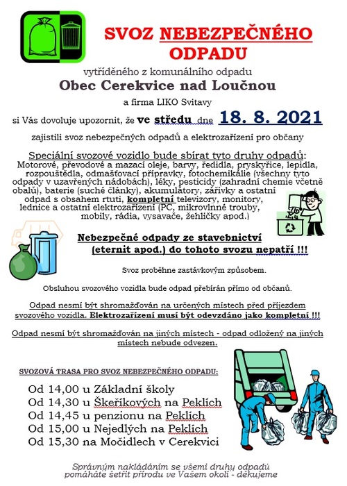 Obec Cerekvice a firma LIKO oznamuje termín svozu nebezpečného odpadu. Svoz proběhne v tradičních časech a na tradičních místech ve středu 18. srpna 2021. Podrobnosti naleznete na vyvěšených plakátech.